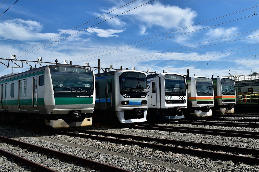 その隣はりんかい線の70-000形と209系試験車"mue train"。りんかい線の方は快速東京テレポートを表示していた。こちらもレアである。