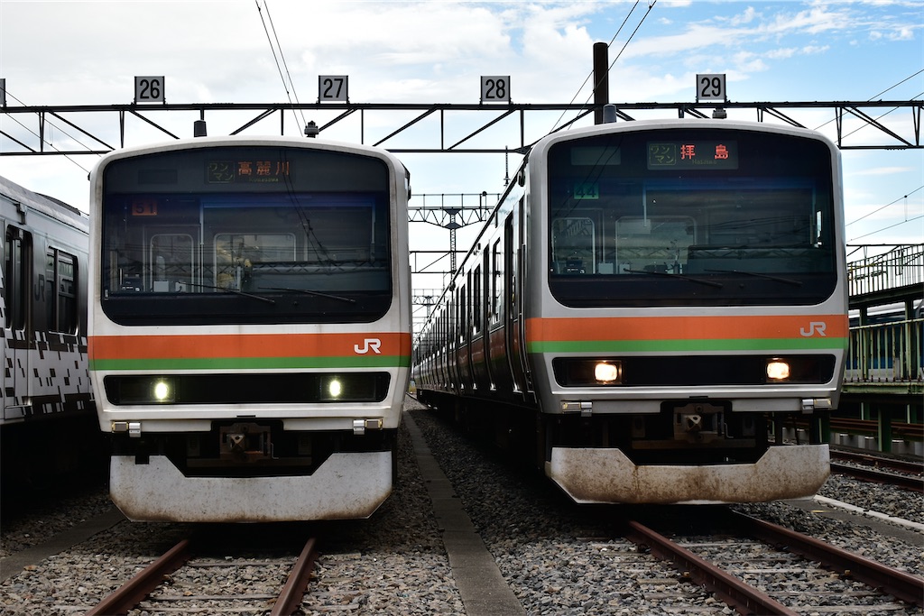 その奥は八高線、川越線で活躍する209系3500番台(左)とE231系3000番台(右)。ワンマン高麗川とワンマン拝島をそれぞれ表示していた。こちらは定期であった気がする(?)